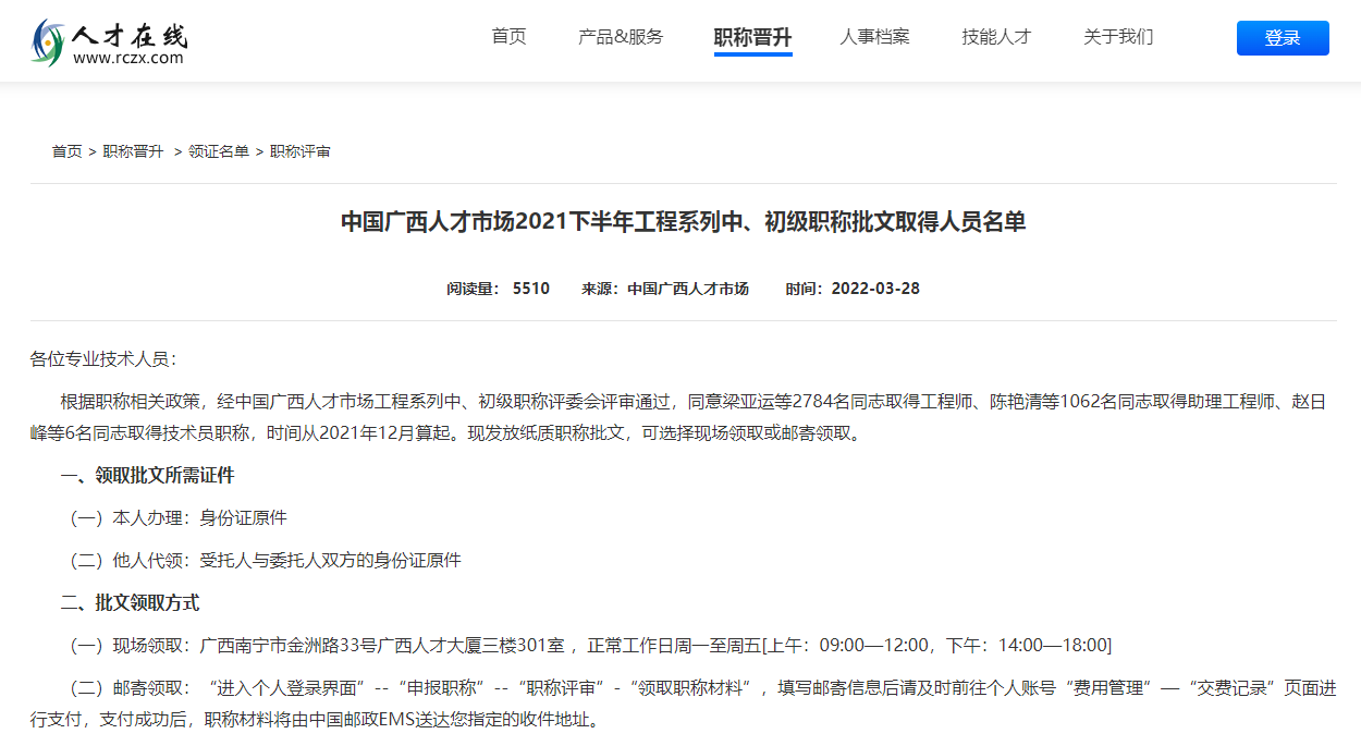好消息!中国广西人才市场-2021下半年工程系列中、初级职称批文可以领取啦!