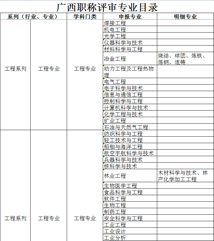 广西工程师职称评审专业一览表