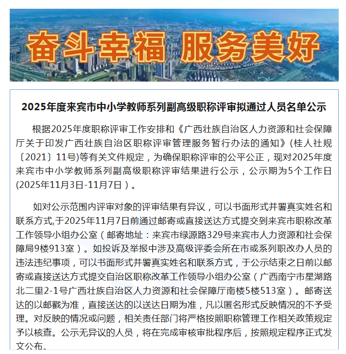 根据2025年度职称评审工作安排和《广西壮族自治区人力资源和社会保障厅关于印发广西壮族自治区职称评审管理服务暂行办法的通知》(桂人社规〔2021〕11号)等有关文件规定,为确保职称评审的公平公正,现对2025年度来宾市中小学教师系列副高级职称评审结果进行公示,公示期为5个工作日(2025年11月3日-11月7日)。