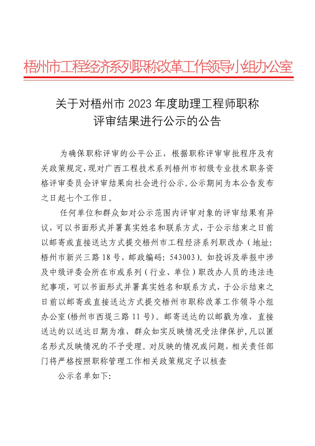 关于对梧州市2023年度助理工程师职称评审结果进行公示的公告